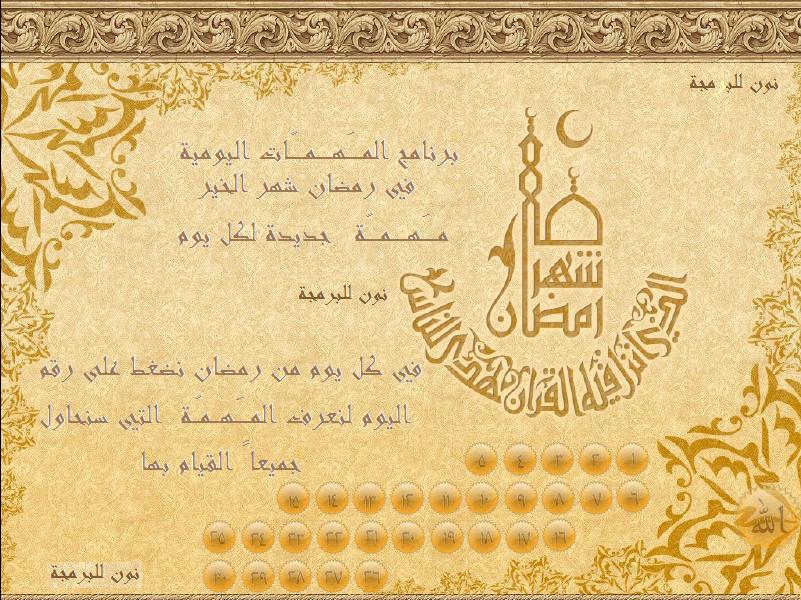 بسم الله الرحمن الرحيم السلام عليكم و رحمة الله و بركاته آسف إن لم يكن الشرح واضحا ً الموضوع هو برنامج صغير قمت بتصميمه فيه فكرة بسيطة آمل أن تعجبكم تعتمد الفكرة أولا ً على تنزيل البرنامج من أحد الروابط الموضوعة ثم و مع أول يوم من رمضان نبدأ العمل به حيث أن كل من قرر الانضمام إلى أسرة المهمـّات الرمضانية بإمكانه أن يضغط على الزر الذي يحمل رقم اليوم الذي يكون فيه " اليوم الأول - > الزر الأول , اليوم الثاني ->الزر الثاني و هكذا " في كل يوم توجد مهمـّة بسيطة صغيرة أجمل ما فيها أن كل واحد منـّا سيتذكر أن له أخوة و أخوات في أسرة المهمـّات تؤدّي نفس المهمـّة معه كل يوم كنوع من التوافق و التضامن الأخوي و العمل بالوحدة الجميلة المهمـّات بسيطة جدا ً يمكنكم الاطلاع عليها جميعا ً دون الانتظار لمضي أيام رمضان آمل أن تعجبكم الفكرة اللهم صل ِ و سلـّم و بارك على الحبيب سيدنا محمد و على آله و أصحابه أجمعين |