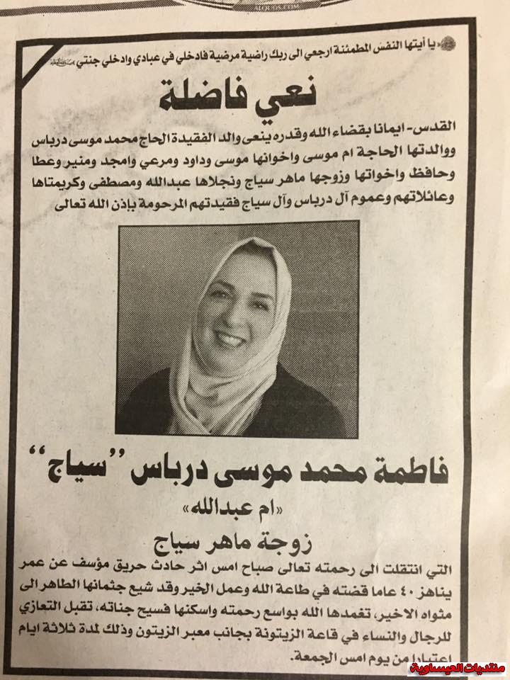 ( يَا أَيَّتُهَا النَّفْسُ الْمُطْمَئِنَّةُارْجِعِي إِلَى رَبِّكِ رَاضِيَةً مَرْضِيَّةً فَادْخُلِي فِي عِبَادِي وَادْخُلِي جَنَّتِي) انتقلت الى رحمة الله تعالى السيدة فاطمه محمد موسى درباس عن عمر ٤٠ عام http://esawiah.com/up/do.php?img=654 http://esawiah.com/up/do.php?img=655 التي وافتها المنيه هذا الصباح على أثر حريق شب في منزلها الكائن في بيت حنينا انا لله وإنا اليه لراجعون رحمها الله وجعل مثواها الجنه والصبر والسلوان لأهلها .. |